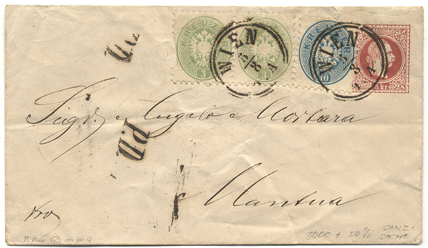 Österreich, 1867, WIEN - MANTUA, 5 Kreuzer - Ganzsachenumschlag der Ausgabe 1867 mit besonders wirkungsvoller und auch seltener Zusatzfrankatur mit waagrechtem Paar Nr 31 + Einzelwert 33 der Ausgabe 1864, lediglich die l... mehr lesen