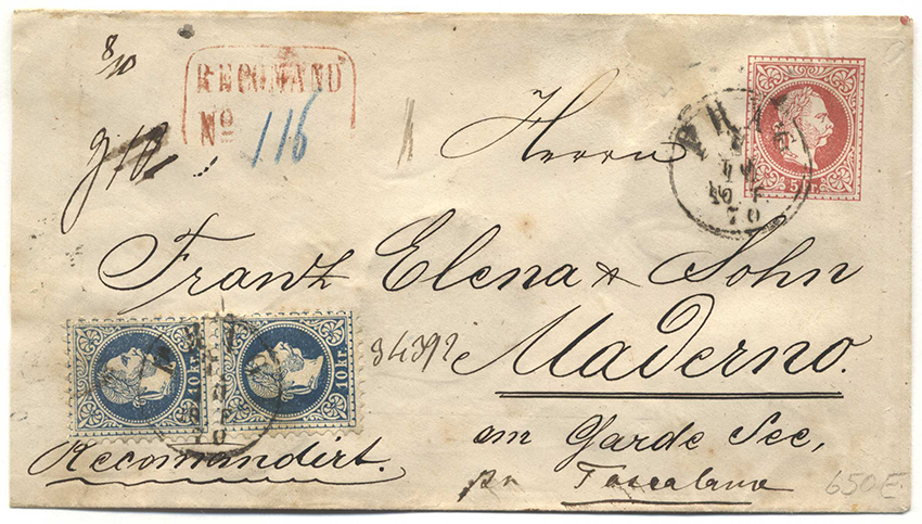 Österreich, 1870, Böhmen, PRAG - MADERNO (Gardasee), sauber beschrifteter 5Kr - Ganzsachenumschlag der Ausgabe 1867 mit 2 x Nr 38 I als Zusatzfrankatur für Porto inkl. vorderseitig geklebtes Reko, rückseitig Ankunftsstem... mehr lesen