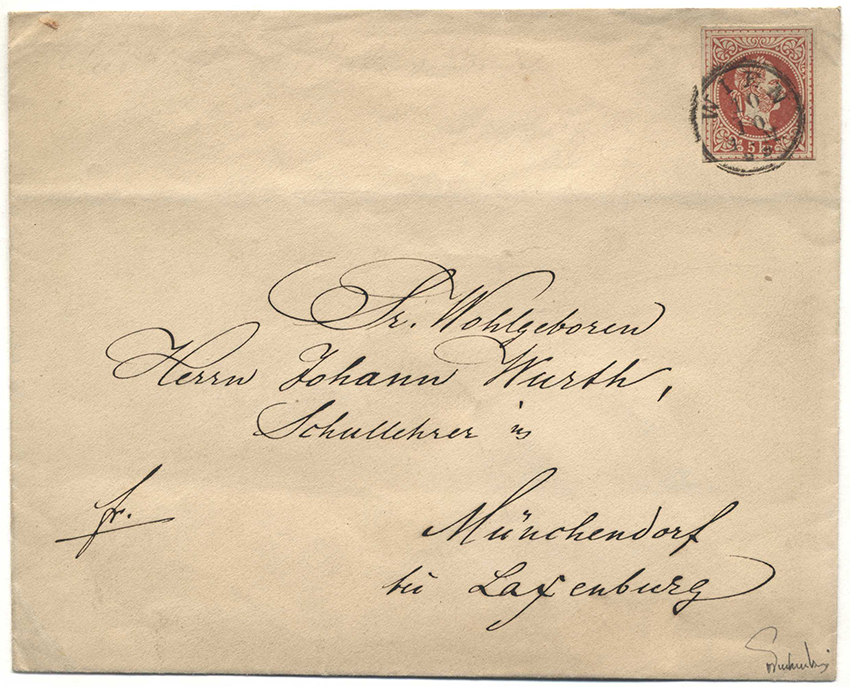 Österreich, 1867, WIEN - MÜNCHENDORF, großformatiges Kuvert mit 5Kr - GANZSACHENAUSSCHNITT der Ausgabe 1867, die unscheinbare Ausschnitt ist sitzend entwertet mit Fingerhutstempel, das Kuvert ist besonders dekorativ besc... mehr lesen