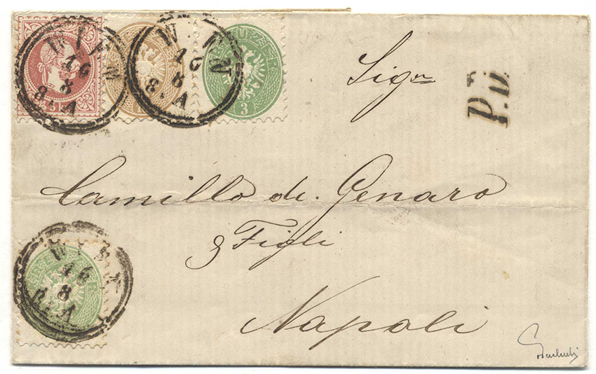 Österreich, 1864/67, Wien/Vororte, WIEN, besonders wirkungsvoller Faltbrief nach NEAPEL mit extrem seltener Stückelung einer 3 - Farben - Ausgabenmischfrankatur, der vorderseitig sauber beschriftete und portogerechte Bel... mehr lesen