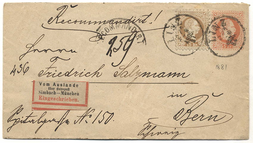 Österreich, 1881, LINZ - BERN, 5Kr - Ganzsachenumschlag mit 15Kr - Zusatzfrankatur als REKO via MÜNCHEN (!) in die Schweiz, vorderseitig mit ungezähntem Aufkleber "Vom Auslande / über Bahnpost / Simbach - München - Einge... mehr lesen