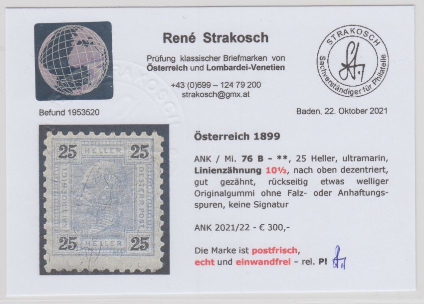 Katalognummer: 160 Österreich, 1899, 76 B, Linienzähnung 10 1/2, postfrisch **, mit Attest, € 300