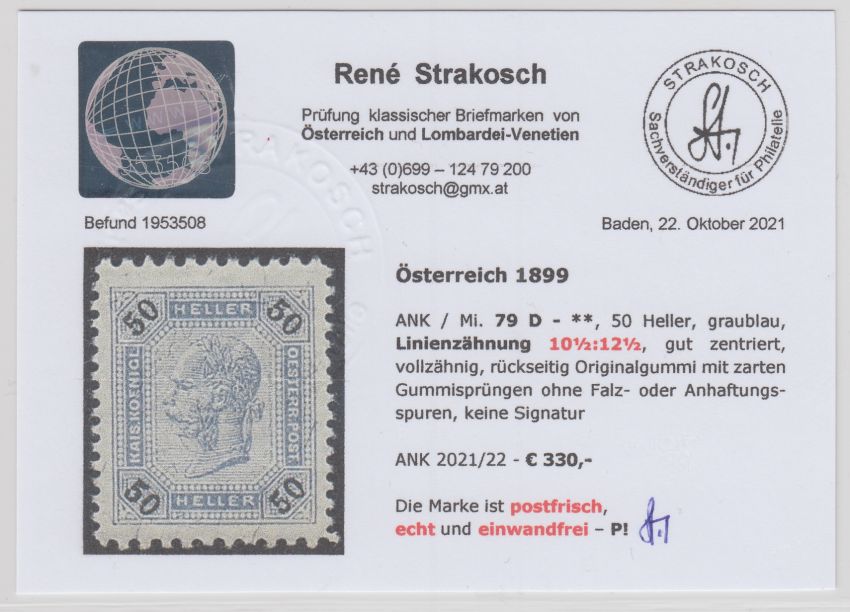 Katalognummer: 161 Österreich, 1899, 79 D, Linienzähnung 10 1/2 : 12 1/2, postfrisch **, mit Attest, € 330