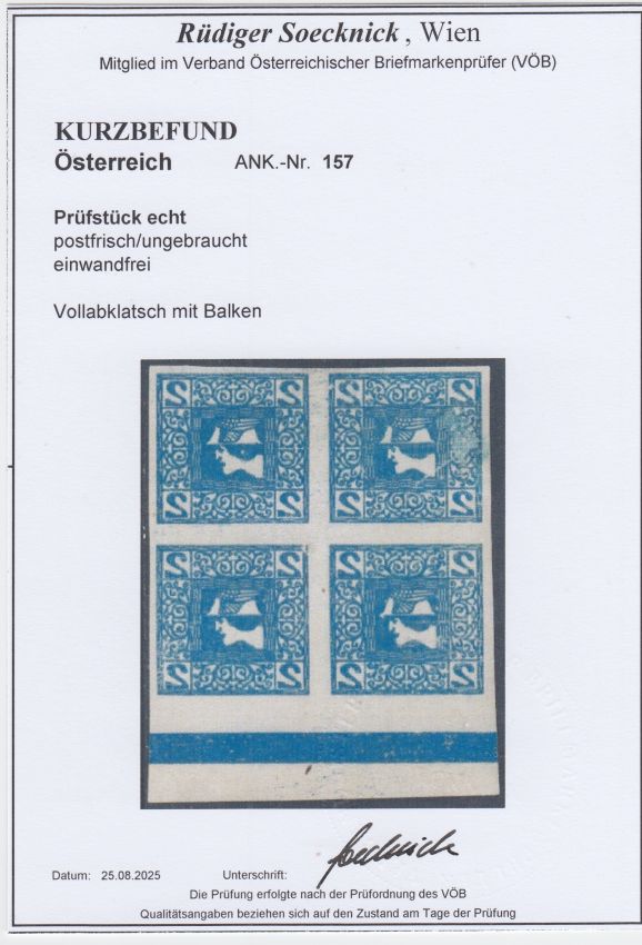 Katalognummer: 168 Österreich, 1908, 157, Viererblock mit Abklatsch, Kurzbefund Soecknick
