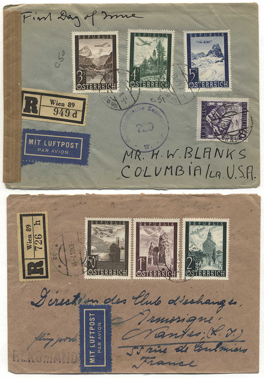 Numero di catalogo: 438 Österreich, 1947, Flugpost, etc. 826, ff; Vier philatelistische Briefe mit Flugpostmarken in die USA !