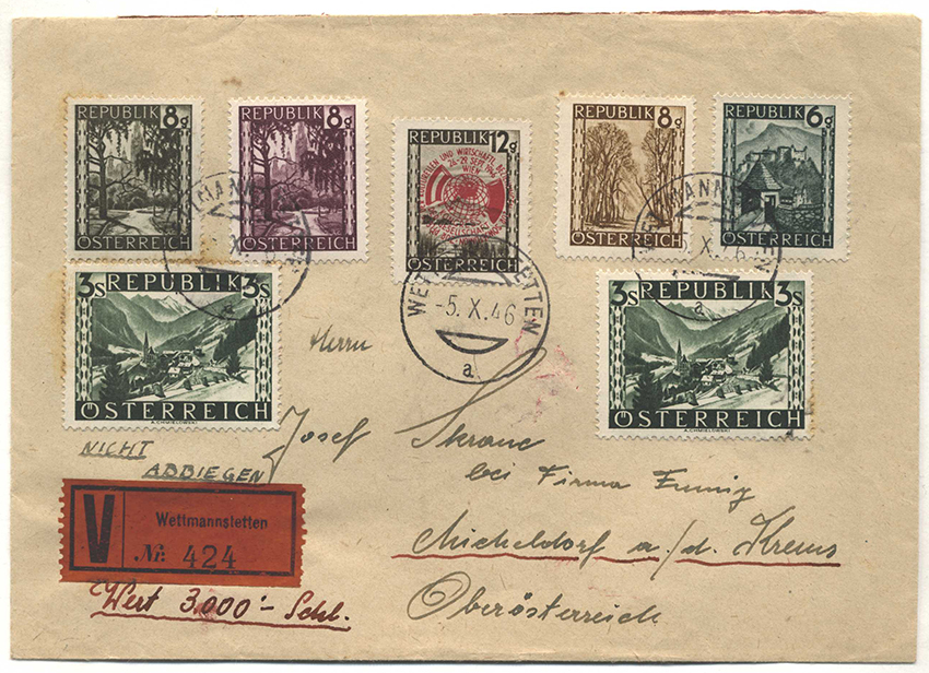 Numero di catalogo: 935 Österreich, 1946, WETTMANNSTETTEN - MICHELDORF a.d.Krems, wirkungsvoller Wertbrief über 3000 Schilling, vorderseitig wirkungsvoll frankiert mit 742 - 744 + 773 (2) + 775, portogrecht frankiert 12Gr - Briefgebühr + 30Gr E... read more
