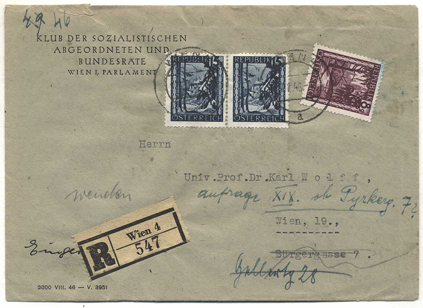 Numero di catalogo: 953 Austria, 1946, VIENNA, probably the only known "DEMAND LETTER" from the first day of ANK 748 dated 27.8.1946, correctly postage paid with 38Gr, in impeccable fresh condition! RRR!