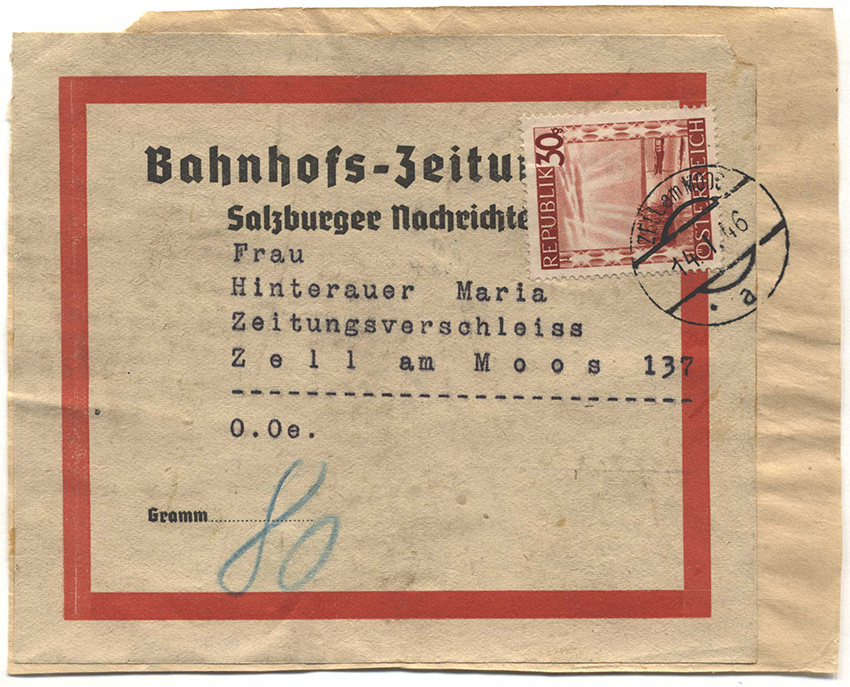 Numero di catalogo: 945 Österreich, 1946, WIEN - ZELL am Moss, portogrechte 30 Gr - Einzelfrankatur einer 5 - fach schweren Drucksache, der Adresszettel in sauberer Erhaltung!