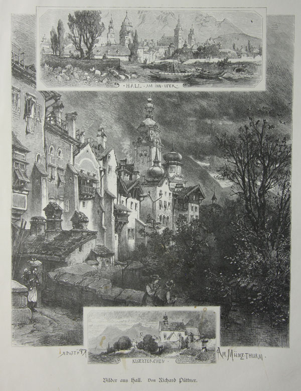 Hall, 3 Ansichten, Holzstich, ca. 1880, 18 x 23,5 cm, Holzstich, sehr gute Gesamterhaltung